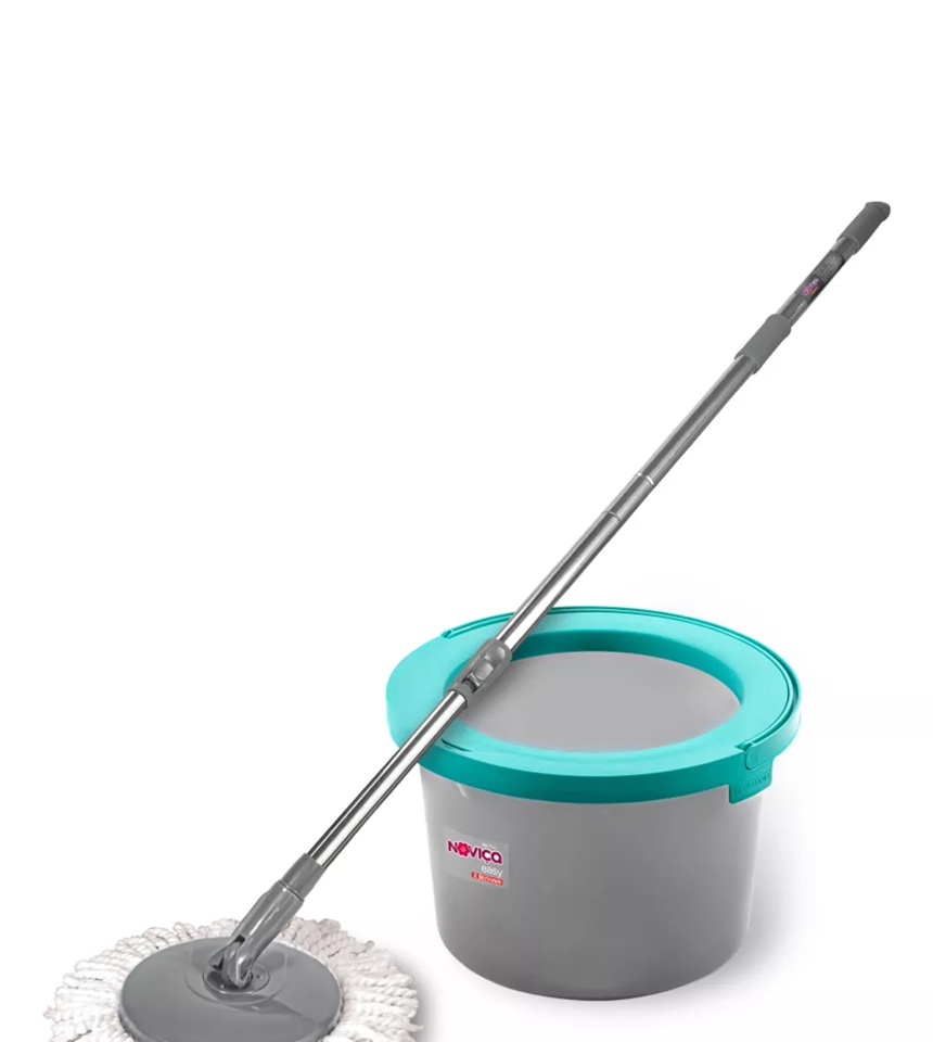 Mop plástico para lavar e secar pisos com sistema giratório prático e fácil de usar.