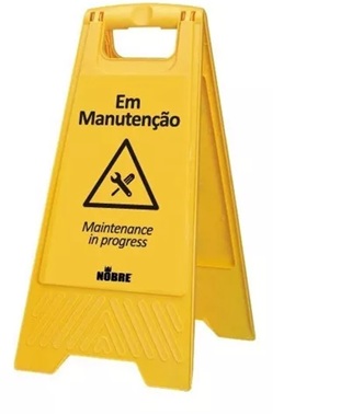 Placa sinalizadora ‘Em Manutenção’, resistente, ideal para segurança de ambientes.